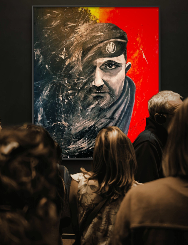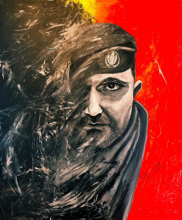 „Funktion“ zählt zu den zentralen Arbeiten von Matthias Hübner. Das großformatige Selbstbildnis thematisiert den Menschen zwischen Auflösung und Kontrolle, zwischen individueller Identität und funktionaler Rolle. Die betonähnlich strukturierte Oberfläche verleiht dem Werk Schwere und Widerstand. Militärische Zeichen erscheinen als systemische Marker, während UV-reaktive Neonfarben die scheinbare Ordnung brechen und innere Spannung sichtbar machen.