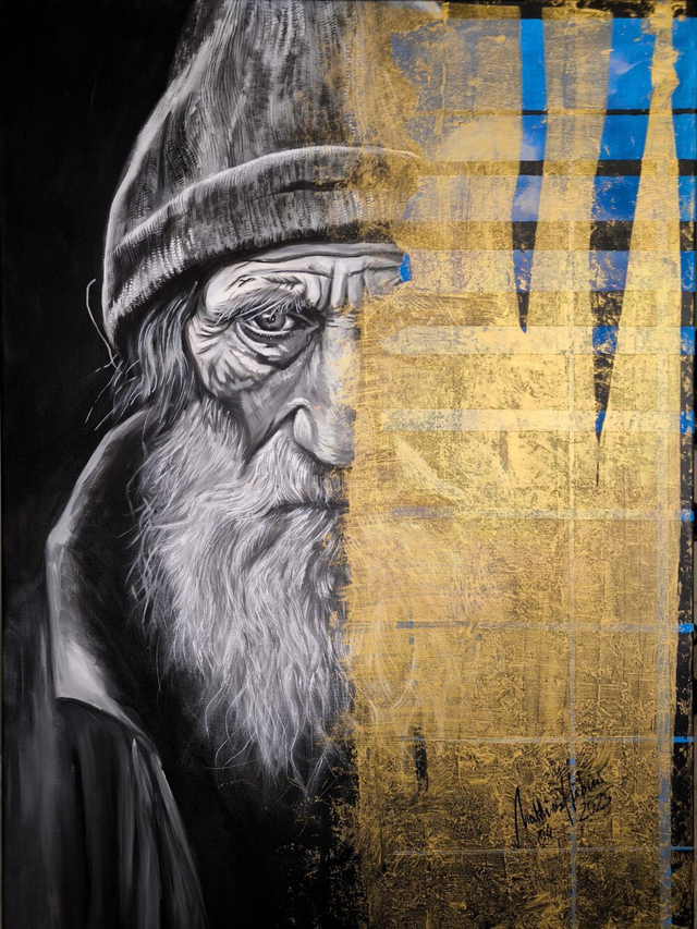 Ein intimes Porträt eines älteren Mannes mit langem Bart und Mütze. Eine Hälfte des Gesichts ist durch eine goldene Fläche maskiert, die das Porträt durchdringt und das Thema des "Goldenen Zeitalters" oder die Kontraste zwischen Licht und Dunkelheit symbolisiert. Subtile blaue Neon-Akzente sorgen für zusätzliche Tiefe und enthüllen unter UV-Licht verborgene Ebenen des Werkes.
