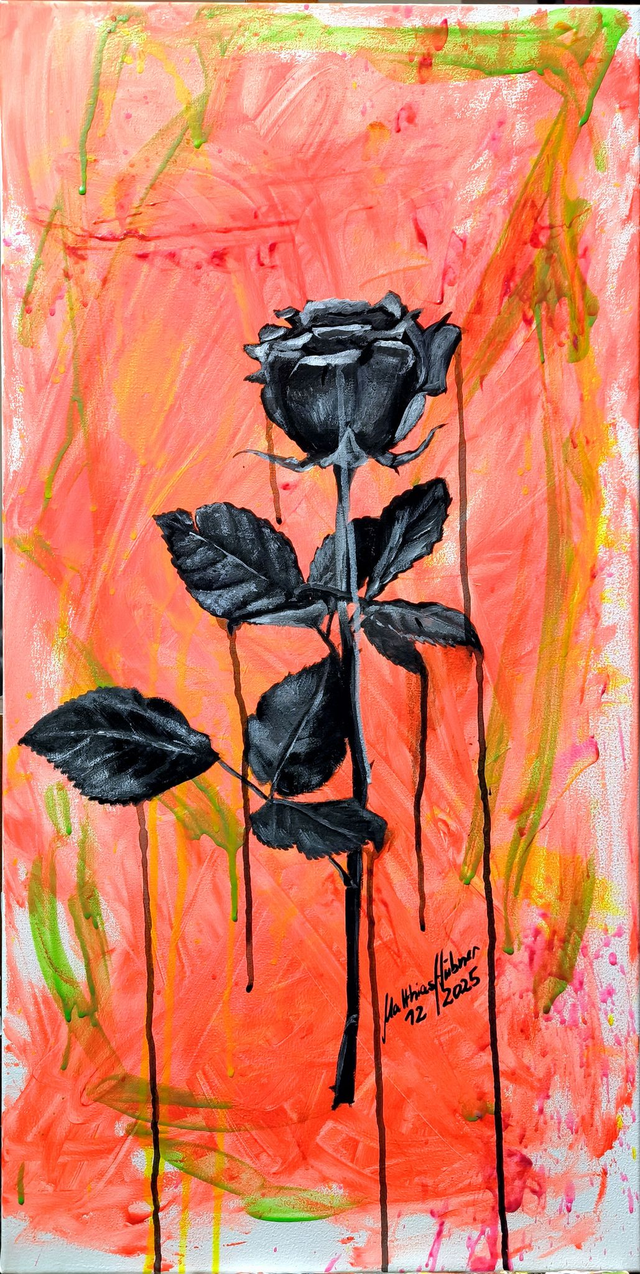 Die Rose ist das zentrale Werk der Werkgruppe NATUR. Vor einem vollständig in Neon gesetzten Hintergrund erscheint das Motiv reduziert und isoliert. Farbe fungiert nicht als Atmosphäre, sondern als künstlicher Gegenraum. Die Darstellung verweigert jede romantische Lesart. Die Rose steht nicht für Symbolik, sondern für Setzung: Nähe und Distanz fallen zusammen, Kontrolle und Projektion bleiben in Spannung. Ein eigenständiges Werk und zugleich der formale wie inhaltliche Anker einer abgeschlossenen Trilogie.